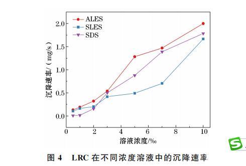 LRC在不同濃度溶液中的沉降時間和沉降速率曲線如圖3和圖4所示。由圖3可知,當(dāng)溶液濃度處于0.5‰至2‰之間時,煤塵在3種溶液中的沉降時間迅速縮短;當(dāng)濃度大于2‰時,煤塵沉降時間差異不大。當(dāng)CSDS≤1‰時,煤塵在SDS溶液中的沉降時間大于1 h,因此,SDS在此濃度范圍內(nèi)不能快速潤濕LRC。當(dāng)CALES和CSLES高于0.5‰時,煤塵沉降時間持續(xù)緩慢縮短,該濃度范圍內(nèi)ALES、SLES溶液潤濕煤塵的時間小于500 s。由此可知,低濃度下ALES、SLES溶液比SDS溶液更容易潤濕LRC。由圖4可知,當(dāng)溶液濃度大于3‰時,煤塵在SDS溶液中的沉降速度大于SLES溶液,拐點(diǎn)處于2‰至3‰之間。因此,當(dāng)溶液濃度小于拐點(diǎn)濃度時,3種溶液潤濕LRC的能力排序為ALES>SLES>SDS;當(dāng)溶液濃度大于拐點(diǎn)濃度時,3種溶液潤濕LRC的能力排序為ALES>SDS>SLES。上述分析表明,高、低濃度的ALES溶液對LRC均具有較強(qiáng)的潤濕性。