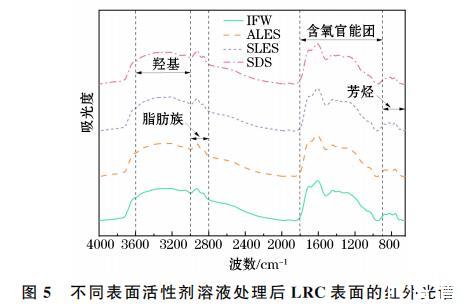 不同溶液處理后煤樣的含氧官能團(tuán)吸收帶的峰面積和官能團(tuán)占比見表1。由表1可知,經(jīng)IFW、ALES、SLES和SDS溶液處理后煤樣的C-O-C的峰面積分別為13.87、14.46、14.73和13.43。表明ALES、SLES在LRC表面均發(fā)生了明顯吸附。由于SDS不含烷基醚基團(tuán),經(jīng)SDS溶液處理后煤樣的烷基醚基團(tuán)所對應(yīng)的峰面積并沒有明顯增加。由于NH4+(1385~1500 cm-1)的非對稱變角振動與-CH3、-CH2的變形振動重合,因此將-CH3、-CH2的變形振動對應(yīng)的峰面積進(jìn)行加和分析。經(jīng)不同溶液處理后煤樣的NH+的非對稱變角振動的峰面積占比分別由25.6%(IFW)增加至26.7%(ALES)、25.9%(SLES)和26.8%(SDS);-CH3和-CH2所占峰面積分別由69.55(IFW)增至75.38(ALES)、71.76(SLES)和72.02(SDS)。上述分析表明,ALES在LRC表面的吸附量要明顯大于SLES和SDS在LRC表面的吸附量。