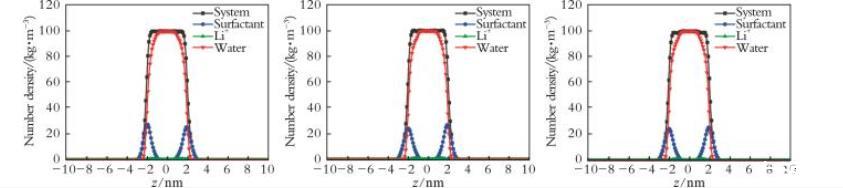 圖4 不同復配體系下z軸方向的數密度分布
