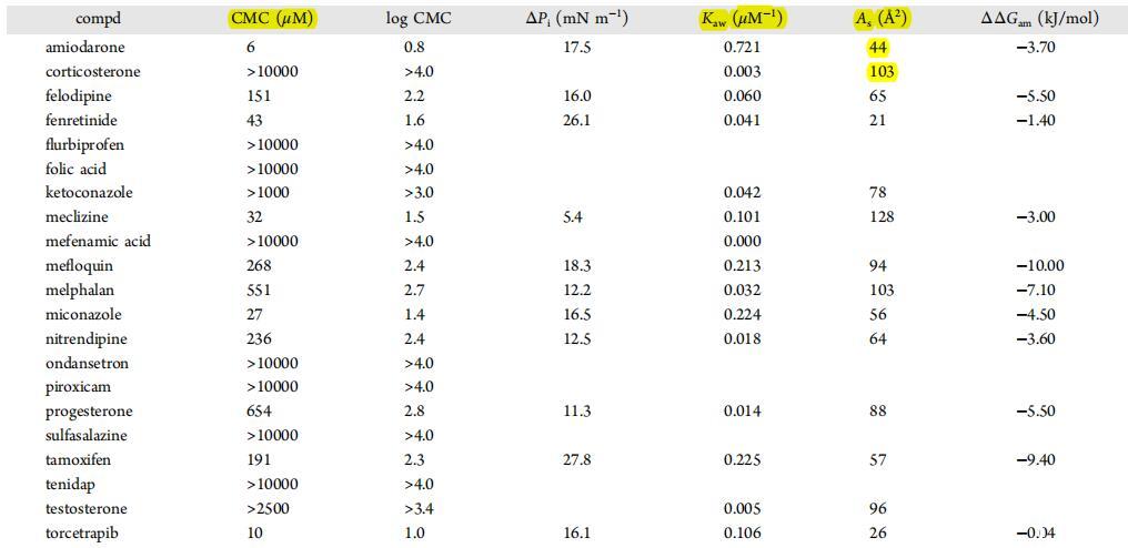 表面活性測(cè)定。化合物在DMSO中連續(xù)稀釋超過12種不同濃度,并在pH值為6.5的0.05 M磷酸鹽緩沖液中添加至最終10%的DMSO含量。最終化合物濃度默認(rèn)范圍為10 nM至10 mM。在第二次實(shí)驗(yàn)中,對(duì)于達(dá)到溶解度極限或需要對(duì)相關(guān)濃度范圍進(jìn)行解析以確定最佳參數(shù)的情況,定義了替代濃度范圍。樣品靜置10分鐘,以便在液體中平衡?空中接口。表面壓力分布在張力計(jì)(MultiPi WS1,Kibron Inc.,芬蘭赫爾辛基)上進(jìn)行,通過之前的測(cè)量(72.8 mN/m)對(duì)50μL等份樣品進(jìn)行校準(zhǔn)。通過對(duì)生成的等溫線進(jìn)行曲線擬合確定表面活性參數(shù),并根據(jù)經(jīng)典的空氣吉布斯熱力學(xué)理論進(jìn)行計(jì)算?水里,臉上。主要導(dǎo)出參數(shù)如下。(i)考:空氣?水分配系數(shù),來自等式2