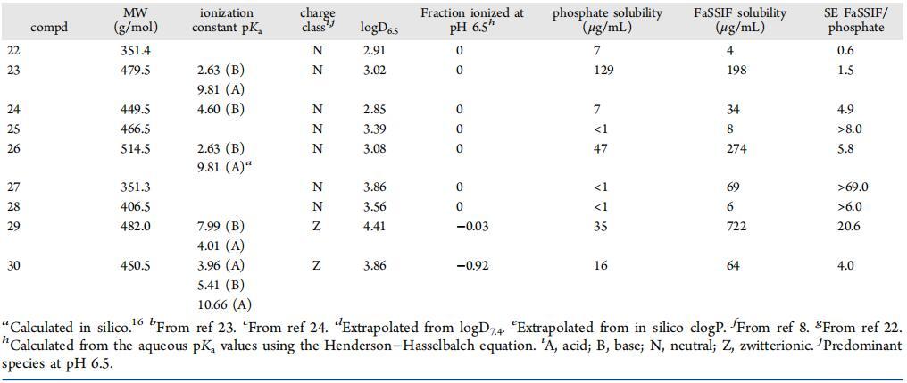 以前曾使用一組參考化合物觀察到,電離酸性化合物的硒通常低于電離堿。結果表明,由于與帶負電荷的FaSSIF介質(zhì)組分之間的靜電排斥作用,離子酸在FaSSIF中的溶解度沒有增加。8在目前的研究中,對于幾個涵蓋更廣泛化學空間的專利化合物,我們沒有發(fā)現(xiàn)離子化酸或堿之間硒的任何顯著溶解度差異,這表明靜電相互作用可能被其他因素掩蓋或覆蓋,如化合物的構象和親油性。