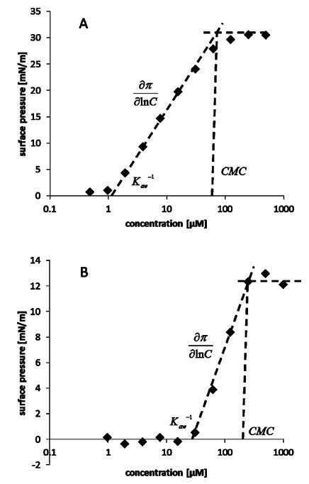 表面活性參數(shù)的測定。表面活性劑的主要參數(shù)由濃度-表面壓力曲線獲得。圖3中描述了代表性化合物的這些參數(shù),表2中總結了完整的數(shù)據(jù)集。