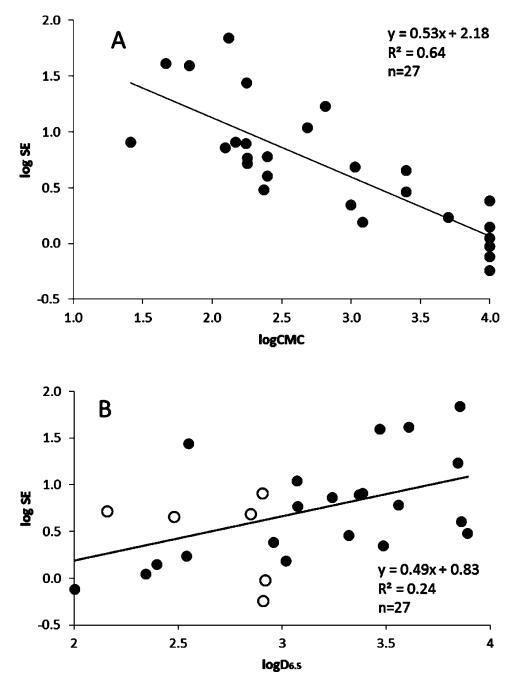 圖5。根據(jù)對數(shù)CMC(μM,A)和pH 6.5下的辛醇分配系數(shù)(logD6.5;B)繪制溶解度增強曲線。數(shù)據(jù)集僅限于顯示logD6的化合物。5個在2到4之間。圖B中的開放圓對應于從文獻檢索、預測或從pH值為7.4的logD推斷的logD值。高于或低于檢測限的值在檢測限處繪制。