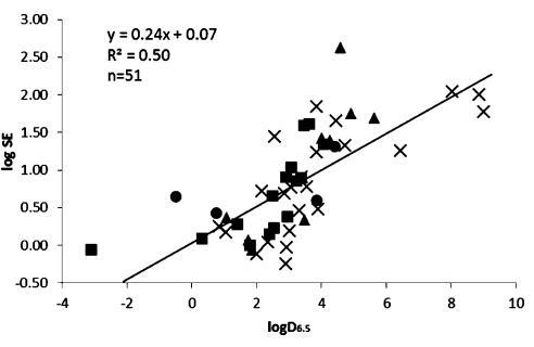 圖2。在pH值為6.5時,51種化合物的溶解度增強(SE=S_-FaSSIF/S_-水溶液)是辛醇/水分配系數(shù)的函數(shù)。化合物被歸類為酸(■),基地(▲),中性(×)和兩性離子(●).高于或低于檢測限的值在檢測限處繪制。