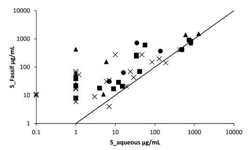 圖1。測定了51種化合物在磷酸鹽和FaSSIF緩沖液中pH值為6.5時的平衡溶解度。化合物被歸類為酸(■),基地(▲),中性(×)和兩性離子(●).線對應于單位線。低于檢測限的值在檢測限處繪制。
