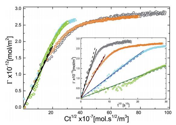 圖5吸附量(G)作為產品Ct1/2的函數。插圖顯示了不同體積濃度的微凝膠顆粒的G與t1/2的單獨曲線:(>)0.10 G l-1,(D)0.20 G l-1,(,)0.50 G l-1,(B)1.00 G l-1。實線是直線擬合,虛線是使用D=DDL計算的坡度繪制的。