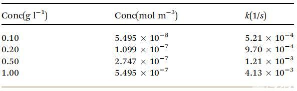 表2根據圖6中的實驗曲線計算的各種濃度的速率常數k(1/s)值