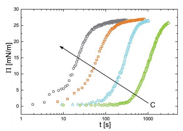 利用實驗狀態方程,我們研究了這些微凝膠顆粒在空氣-水界面上的吸附動力學。我們發現,吸附過程可以清楚地分為兩個階段。在短時間內,吸附過程由顆粒從塊體向界面擴散控制。在很長一段時間內,界面被粒子填滿,從而為新粒子吸附到界面上創造了屏障。這導致G的指數松弛。
