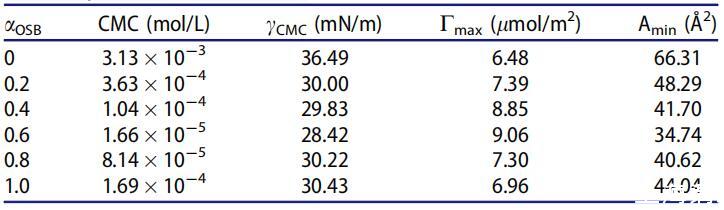 表4。25℃水溶液中不同摩爾分數(αOSB)OSB/SDS體系的表面性質。