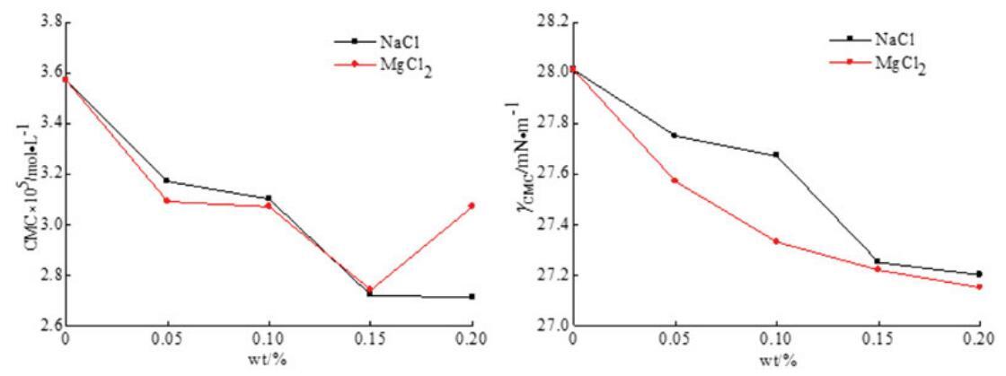 圖9。無機鹽(NaCl和MgCl2)對OCB/SDS體系中表面活性的影響。