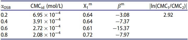 表5。25℃水溶液中不同摩爾分數(αOSB)OSB/SDS體系的非理想性及相互作用參數。