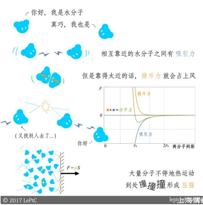 假設上下兩部分的壓強相同(壓強不同的情況將在第二節介紹),由于空氣對水分子的吸引力小于水分子之間的吸引力,所以位于表面的水分子會受到指向液體內部的力,一部分水分子被拉進液體內部,表面層的水分子開始變稀疏,直到吸引力減弱到和空氣接近時趨于平衡。表面層水分子的間距大于r0,因此吸引力占上風: