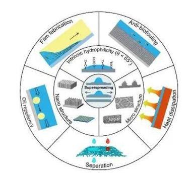 超鋪展領(lǐng)域的研究處于起步階段,盡管近年來取得了快速發(fā)展,但仍存在大量問題:機(jī)理方面,表面水分子的結(jié)構(gòu)與傳統(tǒng)熱力學(xué)中使用的固-氣、固-液表面張力的聯(lián)系仍十分模糊;如何從動力學(xué)角度理解納米結(jié)構(gòu)對超鋪展閾值的影響成為難題。應(yīng)用方面,超鋪展表面的長期穩(wěn)定性仍成為瓶頸,尤其對于暴露在空氣中的表面;大面積超鋪展表面的制備成本較高,限制了其大規(guī)模應(yīng)用。