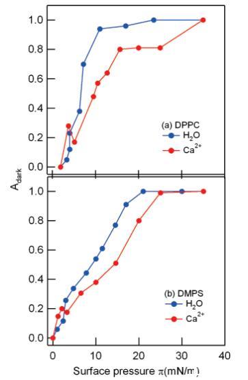 圖4:。在凈水(藍色)和1 M CaCl2溶液(紅色)上,DPPC(a)和DMPS(b)單分子膜的熒光圖像中暗有序LC域的部分面積Adark隨表面壓力的變化。注意周圍標記的局部最大值~在存在Ca2+離子的情況下,兩種脂質均為3 mN/m。