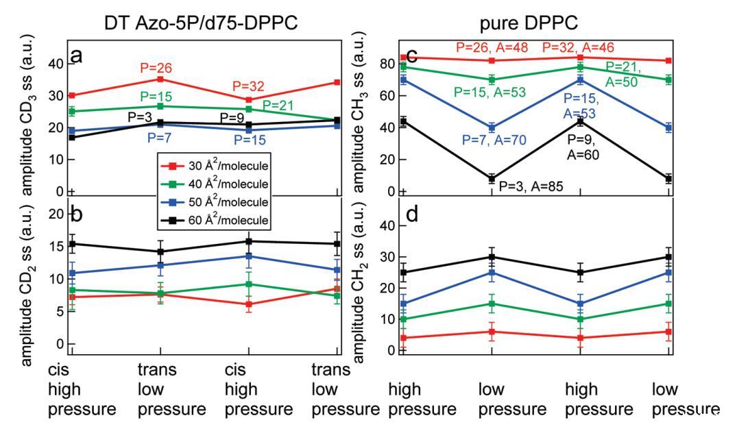 圖8:。d75 DPPC與DT Azo-5P比例為5:1的實驗中d75 DPPC的擬合結(jié)果(左)和純正常DPPC的擬合結(jié)果(右)。(a)CD3對稱拉伸振動模式的振幅隨不同密度光開關(guān)脂質(zhì)狀態(tài)的變化;(b)CD2對稱拉伸振動模式的振幅隨不同密度光開關(guān)脂質(zhì)狀態(tài)的變化;右圖顯示了純DPPC在可比壓力下與左圖相似的結(jié)果,其中(c)為CH3對稱拉伸振動模式的振幅,(d)為CH2對稱拉伸模式的振幅。共振的寬度和頻率在擬合中是固定的。