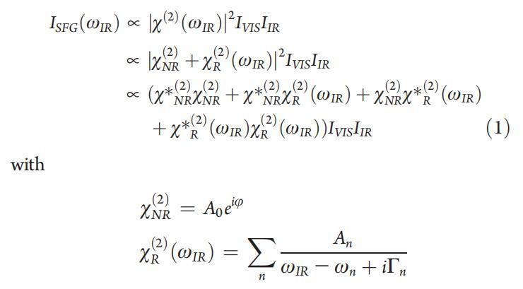 磁化率包含一個非共振項,振幅為A0,相位相對于共振項j,以及一個共振項。后者通過共振頻率ωn、線寬2Γn和振幅An來描述n個振動共振。共振項振幅的相對符號取自文獻。12,27,28擬合結(jié)果如圖3所示,為黑色。事實上,擬合顯示DT Azo-5P的非共振振幅比通常觀察到的脂質(zhì)單層(如DPPC)的非共振振幅大3倍(見下文)。圖3a中的黑色虛線曲線說明了大非共振貢獻對信號的影響,該曲線表示使用DT Azo-5P共振響應(yīng)的計算光譜(從擬合結(jié)果中獲得),但當(dāng)非共振振幅設(shè)置為零時(水振幅設(shè)置為零,尾巴在CH區(qū)域也作為NR信號)。當(dāng)NR振幅設(shè)置為零時,我們觀察到,不僅背景降低,而且視共振信號大小減少了2到5倍,這取決于IR頻率。通過測量羅丹明6G的VSFG光譜,觀察到由于電子躍遷導(dǎo)致的類似信號增強。29,30然而,在這種情況下,作者使用可見光與電子激發(fā)共振,因此他們進行了雙共振實驗。DT-Azo-5P在800 nm處沒有電子躍遷,因此沒有雙共振效應(yīng);這種增強完全是非共振的。因此,對于目前的系統(tǒng),非共振信號外差由于來自χNR(2)和χR(2)的交叉項(見等式1最后一行中的第二項和第三項)而產(chǎn)生共振信號,并增強信號,而不是直接影響χR(2),如羅丹明6G的結(jié)論。29,30因此,外差效應(yīng)不僅是分子內(nèi)的,而且是分子間的,并且可以直接用于增強高度稀釋樣品中的低信號,例如,通過簡單地將含苯部分添加到單層中。這意味著,在這種情況下,VSFG光譜中的信號大小不僅僅是二次依賴于分子數(shù)量,而在大多數(shù)情況下,非共振貢獻非常小。在附錄中,我們證明,由于外差效應(yīng),在存在光脂的情況下,可以測量相對較低水平的DPPC。這種非共振外差可以提供一種檢測分子單分子膜中低濃度分子振動響應(yīng)的有用方法。