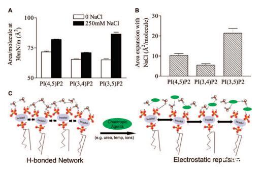 為了確定PIP2特異性膨脹是否主要由大塊肌醇環引起,同時控制酰基鏈組成,用磷脂酰肌醇4-磷酸(LR PI(4)P)和磷脂酰肌醇(LR PI)重復壓力面積等溫線。由于這些分子是細胞中酶促PIP2生成的前體,它們的脂肪酸組成與PIP2相似或相同,只是在肌醇環上的磷酸取代程度不同。與PIP2一樣,兩種肌醇基脂質均未觀察到相變,平均分子面積隨著磷酸取代度的增加而增加,與之前的觀察結果一致。29然而,盡管單磷酸鹽PI(4)P與二磷酸鹽PIP2表現出相同的趨勢,但PI和PI(4)P均未表現出對NaCl濃度增加的顯著擴張,表明類似但小得多的影響(圖2b)。這些數據表明,NaCl誘導PIP2單分子膜擴張的機制與其他陰離子以及其他肌醇基脂質相比,是PIP2特有的。
