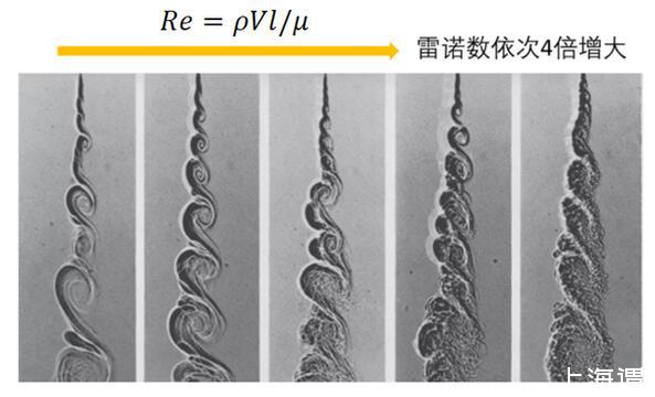 隨著雷諾實(shí)驗(yàn)和雷諾數(shù)被提出來(lái)以后,近代流體力學(xué),尤其是湍流理論的發(fā)展出現(xiàn)了一個(gè)前所未有的盛況,而粘性與湍流的關(guān)系也順理成章的轉(zhuǎn)化成了雷諾數(shù)和湍流的關(guān)系。1974年刊登于《流體力學(xué)》期刊中的一篇經(jīng)典文章,通過(guò)流動(dòng)顯示技術(shù)生動(dòng)形象的描繪了雷諾數(shù)和流態(tài)的關(guān)系:隨著雷諾數(shù)的增大,渦旋的整體形狀和尺度基本一致,然而射流摻混的渦系結(jié)構(gòu)卻越來(lái)越豐富。