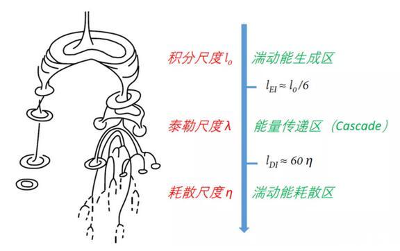 而之所以會(huì)出現(xiàn)上圖中的有趣現(xiàn)象,則要牽扯到湍流的生成、傳遞及耗散:湍流中的大渦會(huì)破碎為小渦,小渦再破碎為更小的“迷你渦”,然后逐漸耗散,這個(gè)過(guò)程與當(dāng)?shù)乩字Z數(shù)相關(guān)。當(dāng)“迷你渦”變得足夠小時(shí),根據(jù)角動(dòng)量守恒,渦的角速度將會(huì)非常大,意味著局部速度剪切很強(qiáng),粘性就變得舉足輕重了,于是,“迷你渦”就這樣被粘性耗散掉了。事實(shí)上,渦的尺度足夠小時(shí),體現(xiàn)為當(dāng)?shù)乩字Z數(shù)非常小,粘性力對(duì)流體的影響則顯著大于慣性力。