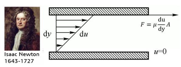 正如前面所說(shuō),人們很早便感受到了流體具有“粘”的屬性,但是如何從科學(xué)上表達(dá)流體的粘性成為了一個(gè)新的問(wèn)題。作為世界物理學(xué)界金字塔尖的男人,牛頓幾乎霸屏了整個(gè)中學(xué)物理課本,當(dāng)然也沒(méi)有放過(guò)流體。1686年,牛頓經(jīng)過(guò)大量的實(shí)驗(yàn)研究,提出了著名的“內(nèi)摩擦定律”——流體的內(nèi)摩擦力(即粘性力)的大小與流體的性質(zhì)(粘性系數(shù)μ)有關(guān),并與流體的速度梯度和接觸面積成正比。