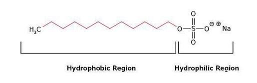圖1.陰離子去垢劑十二烷基硫酸鈉(SDS)的結構,顯示出了疏水區域和親水區域。