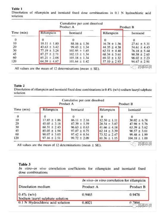 利福平與異煙肼復(fù)方制劑在進行溶出曲線測定時發(fā)現(xiàn)利福平在0.1N鹽酸中不穩(wěn)定,發(fā)生降解。由于利福平在水中不溶,因此采用了0.4%SDS溶液進行了研究,結(jié)果表明在整個分析檢測過程中無降解。而且,0.4%SDS溶液的體內(nèi)外相關(guān)性很好。