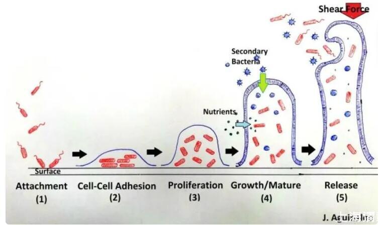 生物膜為微生物分泌物,常見于制藥、食品與個人護(hù)理行業(yè)的生產(chǎn)或水系統(tǒng)中。生物膜可顯著提高微生物對惡劣環(huán)境和消毒劑的抗性,并持續(xù)接納浮游微生物,導(dǎo)致生產(chǎn)或水系統(tǒng)中微生物在清洗消毒后依然頻繁超標(biāo)。