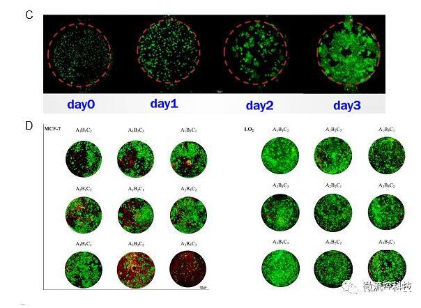 圖4A.微流控腫瘤微陣列藥物測(cè)試系統(tǒng)包含一種復(fù)合式結(jié)構(gòu)開(kāi)放式微流控芯片以及移液工作站;B.微流控芯片上腫瘤微環(huán)境重建的示意圖。3D培養(yǎng)腫瘤細(xì)胞模擬腫瘤實(shí)質(zhì),水凝膠模擬支持和滋養(yǎng)腫瘤細(xì)胞的腫瘤基質(zhì),納米孔薄膜擴(kuò)散屏障模擬血管內(nèi)皮層;C.微流控芯片上連續(xù)三天內(nèi)MCF-7乳腺癌細(xì)胞增殖情況。(Calcein-AM/EthD-1染色,比例尺:200μm);D.抗腫瘤藥物正交組合測(cè)試結(jié)果。藥物測(cè)試包括LO2肝細(xì)胞和MCF-7乳腺癌細(xì)胞對(duì)A.阿霉素,B.紫杉醇和C.順鉑的3因素3水平正交組合藥物的反應(yīng)。