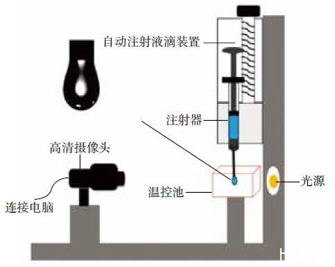 懸滴法是利用滴外形測定表面張力的一種方法,基于數字成像技術,是一種現代的完全數字、計算機化的方法,是一種絕對的測量方法[13,14,15]。該種方法簡單、直觀、誤差小,往往只需準確校正圖像放大比例,且可同時評估靜態表面張力及動態表面張力。