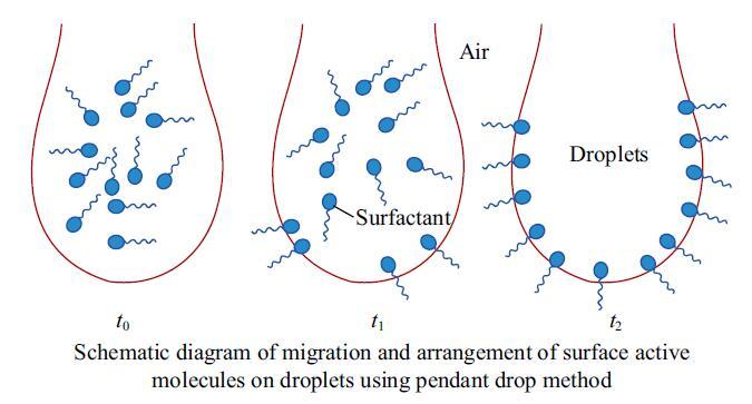 結果表明,在動態表面張力曲線圖中,A,B,C三種樣品在60 mg/kg的較低含量下,表面張力均呈現先快速降低而后緩慢降低最終達到平衡的趨勢,表明表面活性劑分子在液滴表面上確實存在著隨時間變化逐漸吸附平衡,排列完整的現象,如圖4所示,表面活性劑分子在表面完全吸附、排列緊密需要一定的時間,顯然在使用懸滴法進行測定時,時間效應直接影響著表面張力測定的誤差大小,符合前文所述結論。而樣品B在100 mg/kg含量下,動態表面張力趨勢圖成一條直線,證明該種表面活性劑在液滴表面遷移速度較快,在液滴完全注射形成之前已快速到達平衡狀態,表面活性劑分子在表面得以充分排布,這解釋了較低含量的表面活性劑溶液的靜態表面張力與國標推薦方法吻合程度差異較大的原因。這是由表面活性劑分子自身性質所決定的,與其極性基的類型、結構、個數、疏水基長度等息息相關。而單一液體,未具有含量差,故不存在表面活性劑分子從溶劑內部遷移吸附至表面這一過程,所以其動態表面張力曲線呈現為平穩直線。