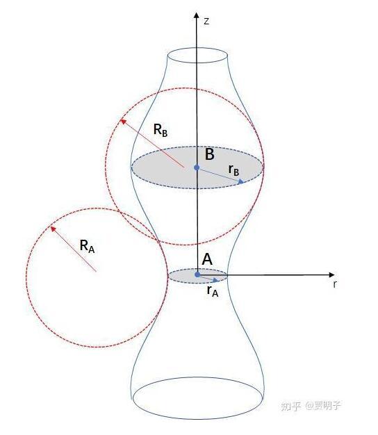 在A點,z方向上產生了負曲率(半徑RA),而r方向上,由于半徑變小,曲率變大。也就是說,A點上的曲率變化產生了兩個效果: