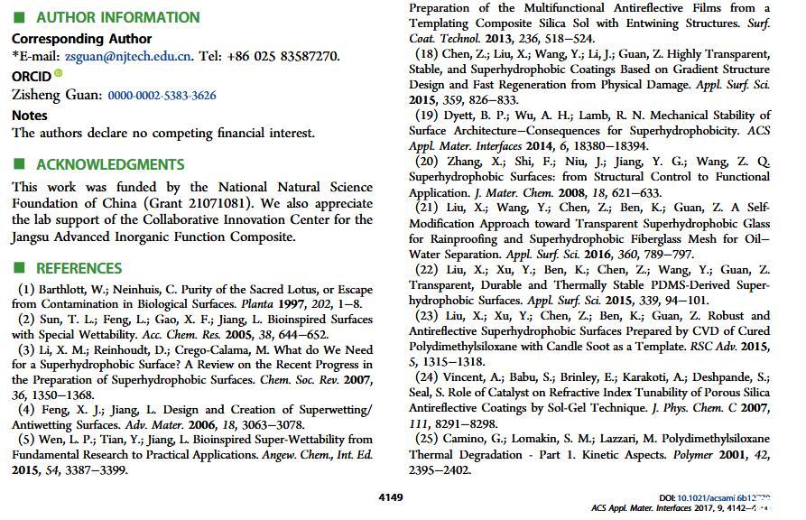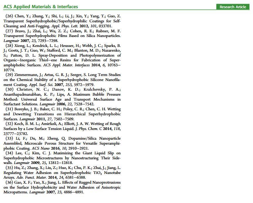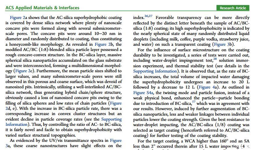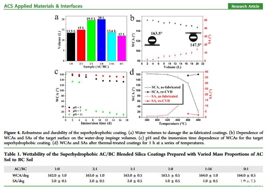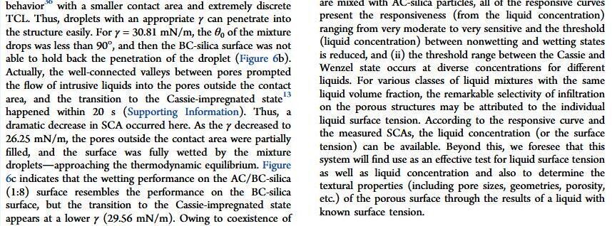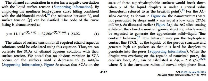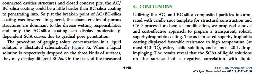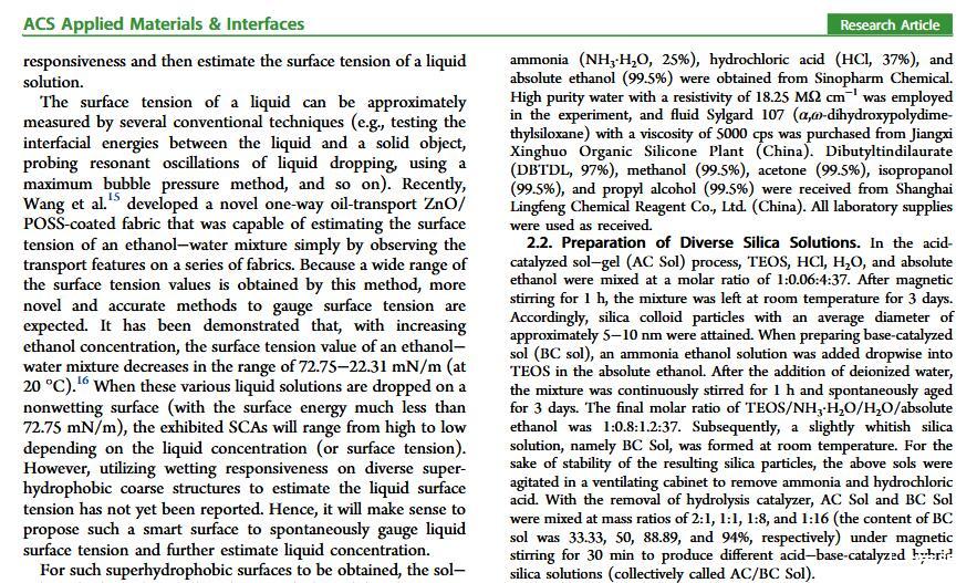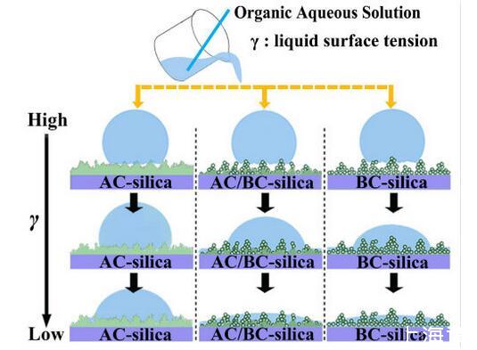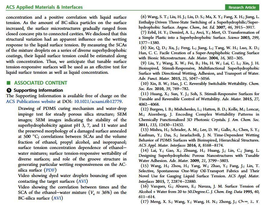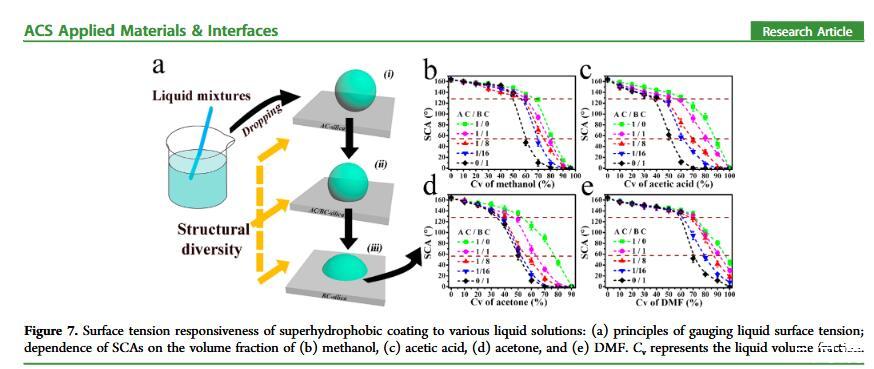 當液體的表面張力發生變化時,它在普通固體表面的潤濕性也會隨著變化。然而,關于這一規律以及尤其是在超疏水表面的表現的研究很少。最近,協同創新中心PI-6管自生老師課題組研究生王研等人利用上述的表面張力和潤濕性的響應關系首次將透明超疏水涂層應用在探測液體表面張力方面,為拓寬多功能超疏水涂層的應用提供了一個新的思路,相關論文已被ACS applied materials&interfaces發表。研究表明,隨著有機物水溶液中有機物體積分數上升,溶液的表面張力相應地下降,溶液液滴在制備的超疏水涂層的接觸角也逐漸下降,此稱之為表面潤濕性對表面張力的響應。基于此響應關系,可以通過接觸角估測液體的表面張力以及有機物的濃度。