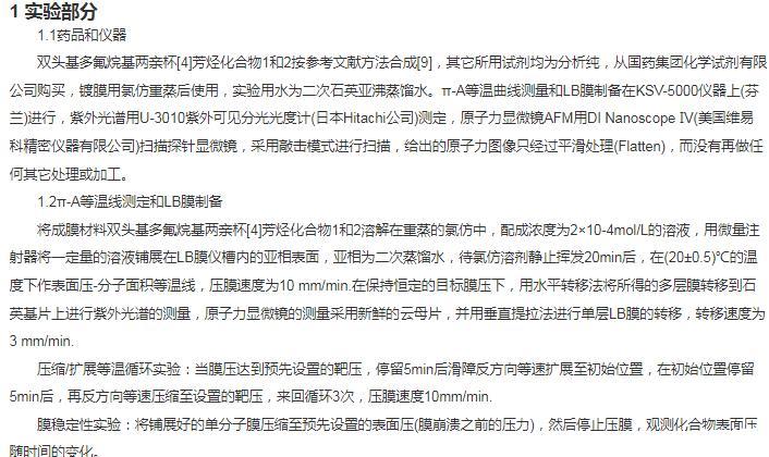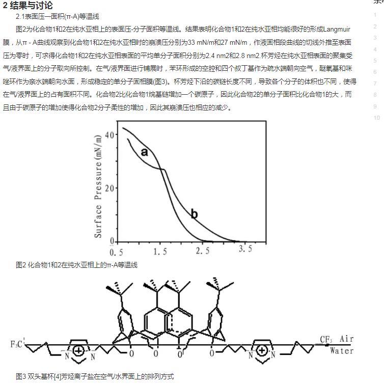 Langmuir-Blodgett膜技術(shù)(LB膜)是一種精確控制薄膜厚度和分子排列的單分子膜沉積技術(shù),即在水氣界面上能將成膜材料分子加以緊密有序地排列,形成單分子層,然后再轉(zhuǎn)移到固體襯底上的制膜技術(shù),利用該技術(shù)可以將功能化合物的光學(xué)、電磁學(xué)、分子識(shí)別與催化等性質(zhì)轉(zhuǎn)移到膜材料中。杯芳烴是繼環(huán)糊精、冠醚之后出現(xiàn)的第三代超分子主體分子,它具有空腔可調(diào)節(jié),構(gòu)象可變換,并易于化學(xué)改性和修飾等特點(diǎn),特別是對(duì)它進(jìn)行適當(dāng)修飾以后的化合物在材料化學(xué),配位化學(xué),生物化學(xué)等領(lǐng)域表現(xiàn)出潛在的應(yīng)用前景與研究價(jià)值。基于上述認(rèn)識(shí)最近我們合成了雙頭基多氟烷基兩親杯芳烴化合物1和2(圖1),并對(duì)該化合物在空氣/水相界面的成膜性能以及LB膜的結(jié)構(gòu)進(jìn)行了研究。