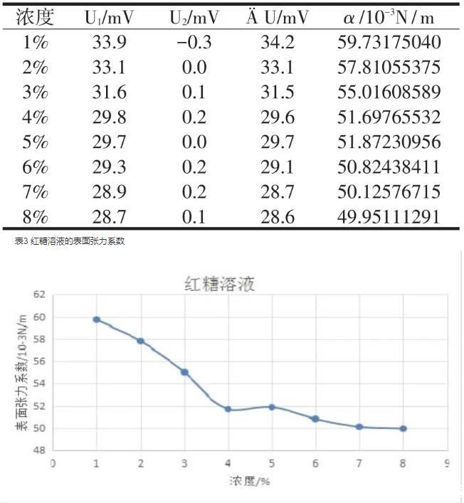 由測量數據及圖像可看出,與純水的表面張力系數(72.75×10-3N/m)相比,當加了蔗糖后,其表面張力系數均有所降低。在同一濃度下,白糖溶液的表面張力系數大于紅糖溶液的表面張力系數;對于白糖溶液,隨著濃度的增加,表面張力系數先快速減小,在4%的濃度時表面張力系數達到最小,之后又有小幅增加;對于紅糖溶液,其表面張力系數要低于白糖溶液,隨著濃度的增加,表面張力系數減小,只是在濃度較小時減小的快,濃度較大時減小的慢。