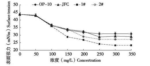 農(nóng)藥制劑噴霧使用時,藥液的表面張力會影響到藥液在植物葉片上的潤濕性能和持留量,很多藥液難以在水稻、小麥和甘藍葉面濕潤展布,是由于藥液的表面張力大于這些植物的臨界表面張力,因此要選用能顯著降低表面張力的表面活性劑,或增加表面活性劑的用量,使藥劑推薦劑量藥液的表面張力值小于水稻的臨界表面張力值,才能有利于藥液在水稻等葉面上的濕潤。本研究中發(fā)現(xiàn),2.3%甲維鹽微乳劑在推薦使用倍數(shù)下,對應(yīng)藥液表面張力43.8 mN/m明顯高于水稻的臨界表面張力36-38 mN/cm,表現(xiàn)為藥液在葉片上難潤濕展布,因此本文通過添加4種助劑來降低藥液表面張力,當(dāng)藥液表面張力低于靶標(biāo)作物葉面表面張力時,藥液才能在葉面潤濕展布,提高噴霧藥液的持留量和鋪展面積,綜合考慮,4種助劑表現(xiàn)最優(yōu)是乳化劑1#,其次是乳化劑2#,然后是JFC,OP-10表現(xiàn)最差。