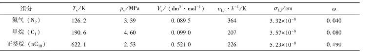Zhang等[11]設計出納米實驗裝置,并測量甲烷-正葵烷(C1-nC10)和氮氣-正葵烷(N2-nC10)混合物在納米孔(rp=50 nm)中的界面張力,其具體測量值見表1。對比實驗測量的界面張力與模型預測值,是檢驗建模正確性的重要方法之一。因此,筆者對不同溫度下的C1-nC10和N2-nC10混合物的界面張力進行預測,其使用到的純組分狀態方程參數列于表2。