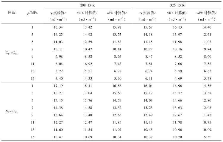 表1 C1-nC10和N2-nC10混合物在298.15 K、326.15 K下的納米孔中測量和模型預測的界面張力(IFT)