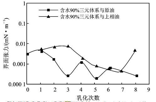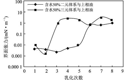 從總體上看,水相與原油間的界面張力低于其與上相油間的界面張力,在乳化第6次以后兩者開始趨同。說明乳化會導致油相中的組成發生變化,進而導致油相性質發生變化。因此在復合驅驅替的適當時機應對驅油體系的配方進行相應調整。
