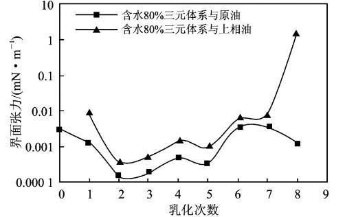 (2)水相與上相油間界面張力達到超低的乳化次數隨含水增加而增加。乳化次數相同時,水相與原油間界面張力低于其與上相油間界面張力。隨著乳化次數增加,三元體系與原油間界面張力值有先下降后升高的趨勢,這種變化趨勢有利于啟動剩余油。多次乳化導致油相性質發生變化,因此在復合驅驅替的適當時機應對驅油體系的配方進行相應調整。