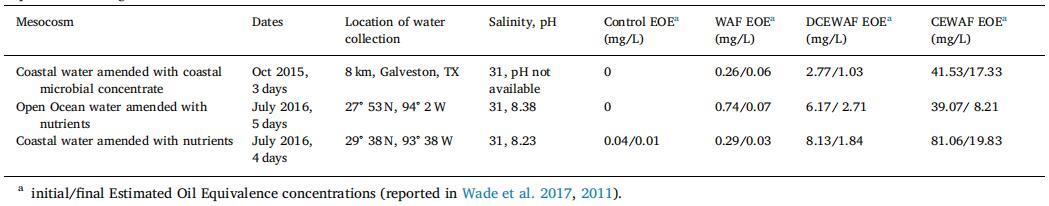 海水是從墨西哥灣收集的,用于填充 12 罐,每個(gè) 130 L,其中 4 個(gè)處理一式三份: 對(duì)照(海水)、WAF(用 Macondo 替代油,一種輕質(zhì)低硫原油,化學(xué)性質(zhì)類似于 在深水期間從 Macondo 井中溢出的石油 Horizon 事件)、CEWAF(Corexit + oil 比例為 1:20)和 DCEWAF (CEWAF 稀釋十倍)。 仔細(xì)描述了中間宇宙的設(shè)置 在韋德等人。 (2017) 以及準(zhǔn)備 WAF 的程序, CEWAF 和 DCEWAF。 簡(jiǎn)而言之,注入油或油 + Corexit 進(jìn)入帶擋板的再循環(huán)罐并混合約 24 小時(shí),然后將下層 分?jǐn)?shù)(即,避免表面光滑)被添加到各自的 坦克。 有關(guān)中宇宙實(shí)驗(yàn)的信息在表 1 中給出 根據(jù)估計(jì)值添加初始和最終油濃度 根據(jù) Wade 等人確定的油當(dāng)量 (EOE)。 (2011 年,2017 年)。 實(shí)驗(yàn)持續(xù) 3 到 5 天,運(yùn)行 12:12 明暗循環(huán)。 在表 1 中,對(duì)于使用沿海 用微生物濃縮物修正的水域,浮游生物(≥63 μm)是 用網(wǎng)收集并轉(zhuǎn)移到聚碳酸酯瓶中。 這個(gè) 將濃縮的浮游生物塊引入罐中并攪拌(2 L 到每個(gè))在開始實(shí)驗(yàn)之前。 對(duì)于公海水域和沿海水域的中宇宙,營(yíng)養(yǎng)物質(zhì)進(jìn)行了修正, 添加營(yíng)養(yǎng)物(最終濃度 f/20)并攪拌罐。